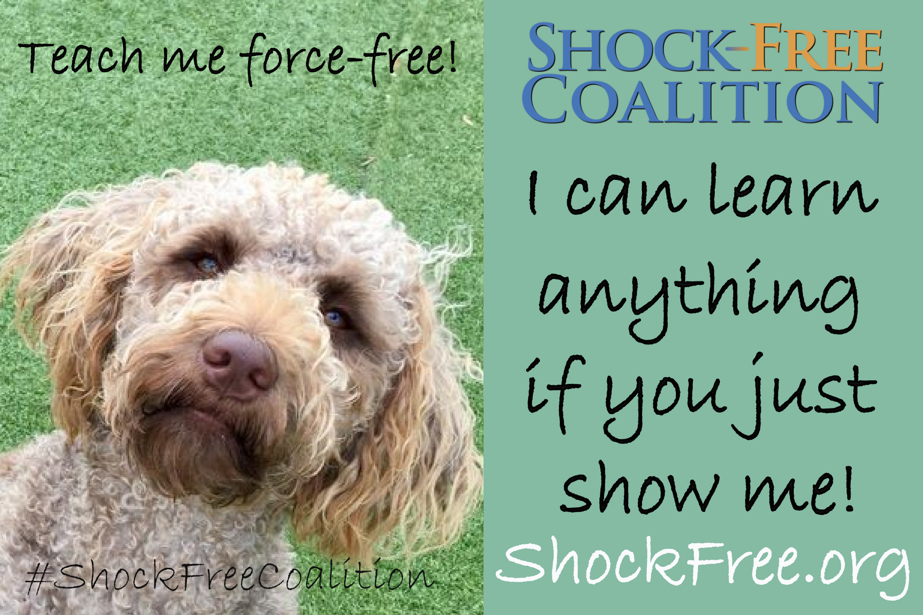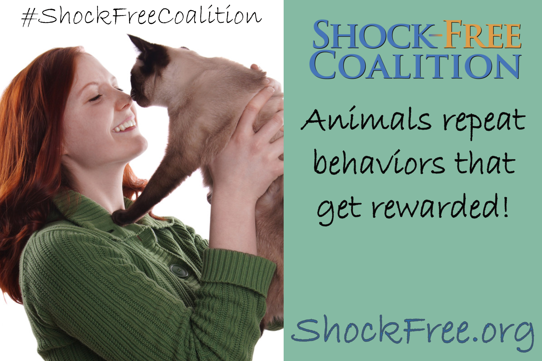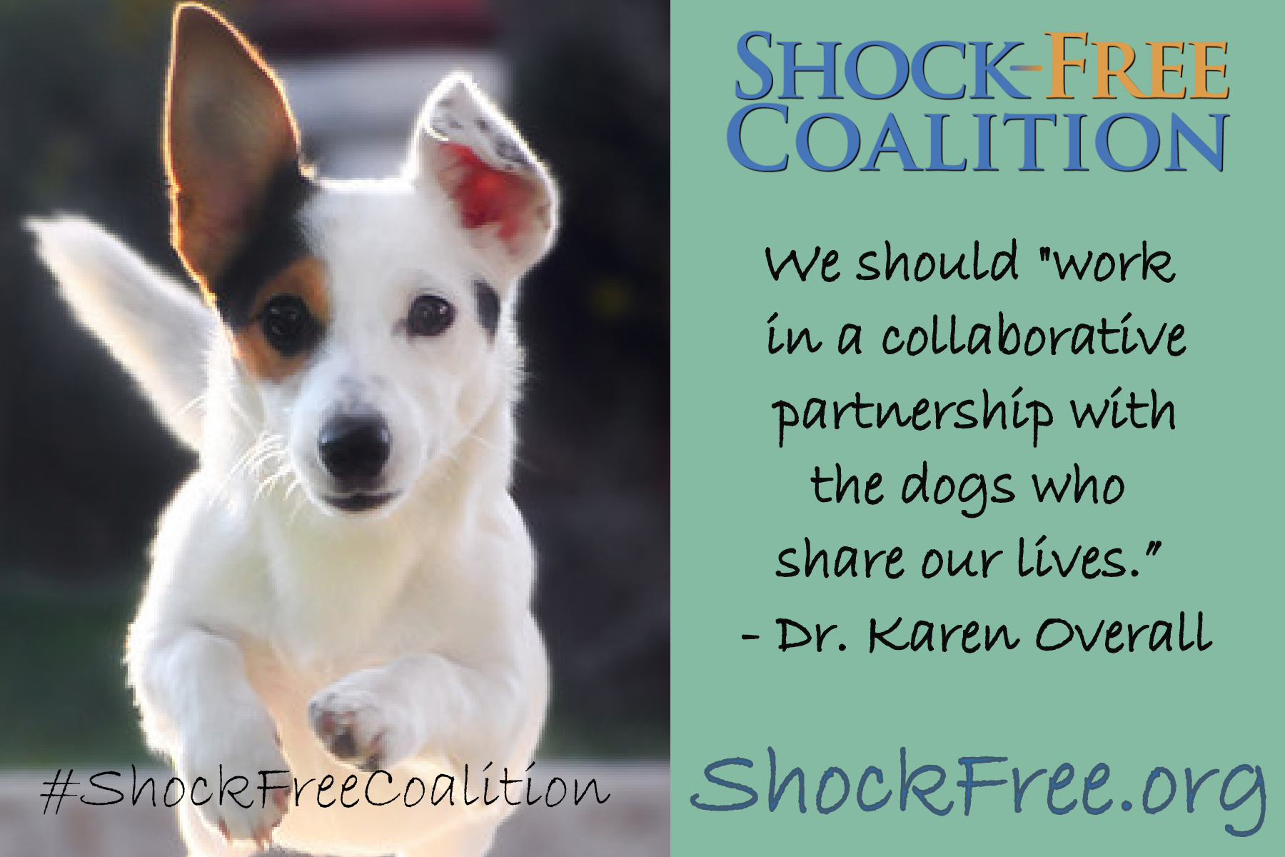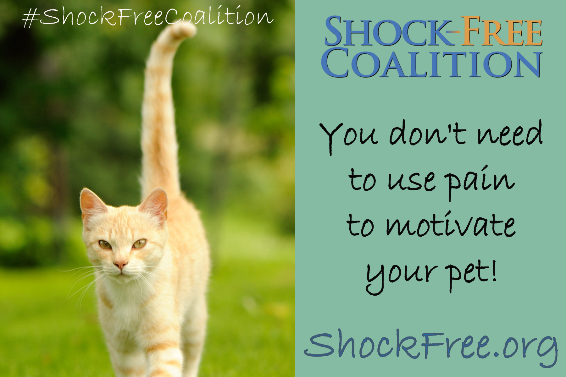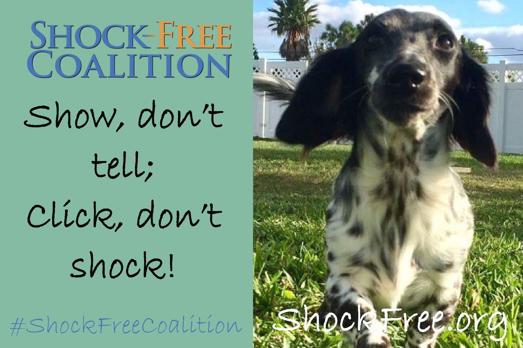 The Shock-Free Coalition believes that pets have an intrinsic right to be treated humanely, to have each of their individual needs met, and to live in a safe, enriched environment free from force, pain and fear.