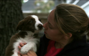 For one month Rum stayed home, so that he could start to feel safe. Then began the tedious process of gradually shaping Rum to leave the house. First, clicking and treating for simply looking out the open front door, then planting cookies outside so that Rum could step out onto the front door mat and find a treat. This training continued for months until Rum could hop into the car and be happy. Gradually building up to longer time periods in the car, Rum ate dinner in the car and played games in the car. Three months later, Rum arrived at the school, a different dog. Joyous and happy he clobbered Angelica with love. The puppy Rumble was back.