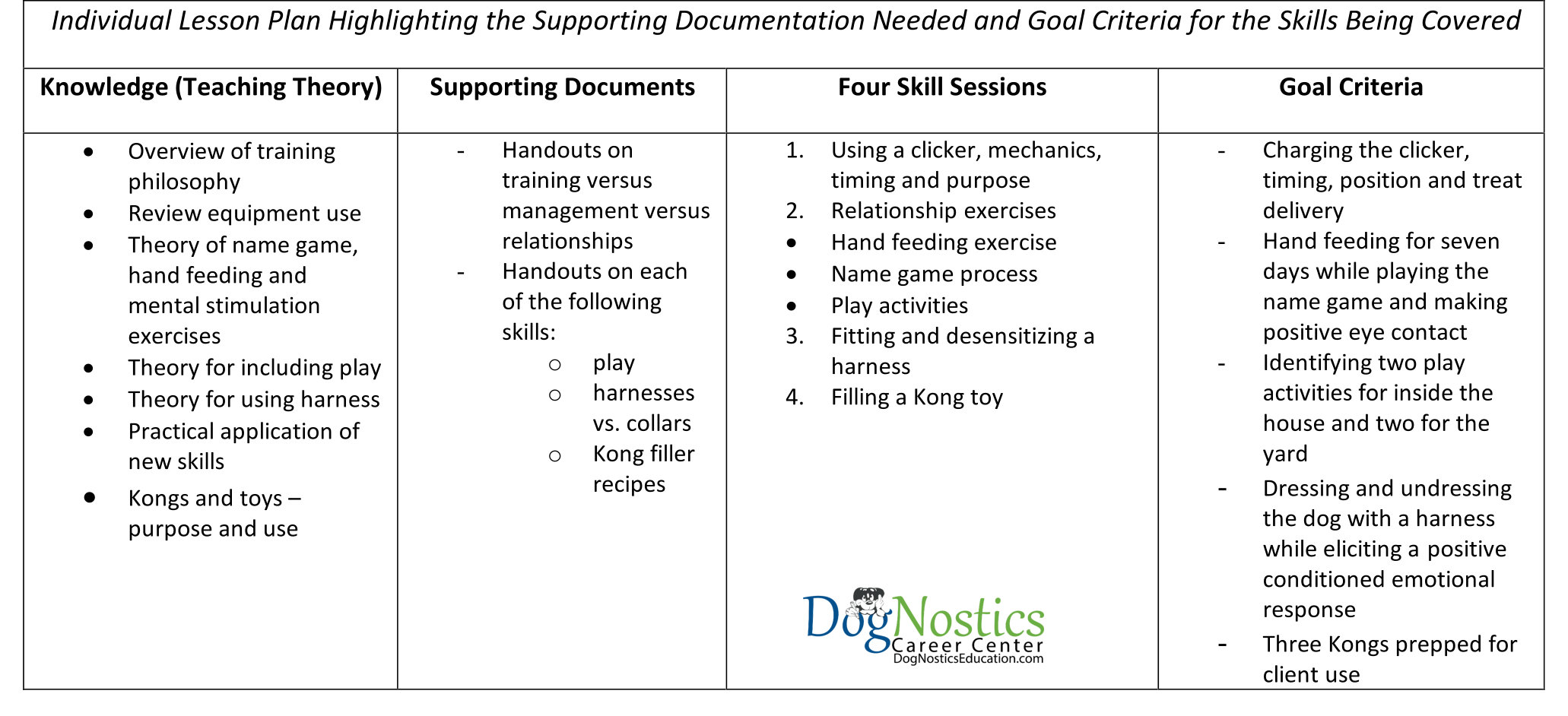 Note that in the lesson plan there is a column for goal criteria. This will ensure we know the exact criteria each skill will be trained to in any individual lesson.