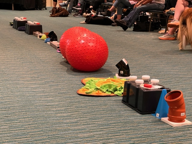 Activating your dog’s seeking system proves beneficial in a wide range of applications. Finding tasty food gives puppies confidence and puts dogs at ease in new environments. You can incorporate the search for treats around the introduction of novel items for puppy socialization. Several of the dogs at the workshop visibly calmed while engaged in sniffing activities, and the dogs maintained their focus on sniffing while doors opened nearby or other dogs barked.