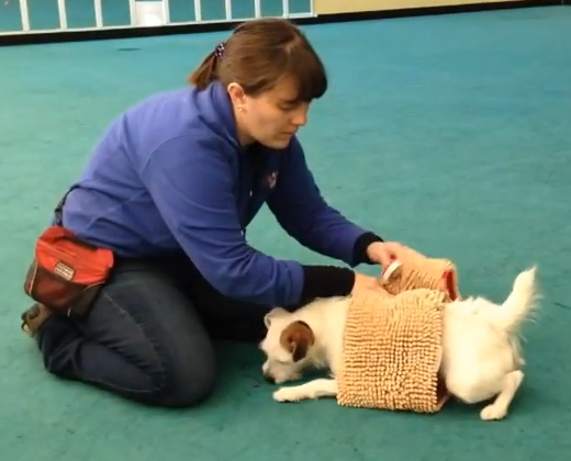 One of many things that we have worked on with Cali is to start tolerating touch and grooming. As winter was nearing in Chicago the family wanted to be able to towel dry Cali. This is one behavior that has always produced some level of aggression from Cali. The level depends on who is towel drying her. It can be a low growl all the way to a bite.