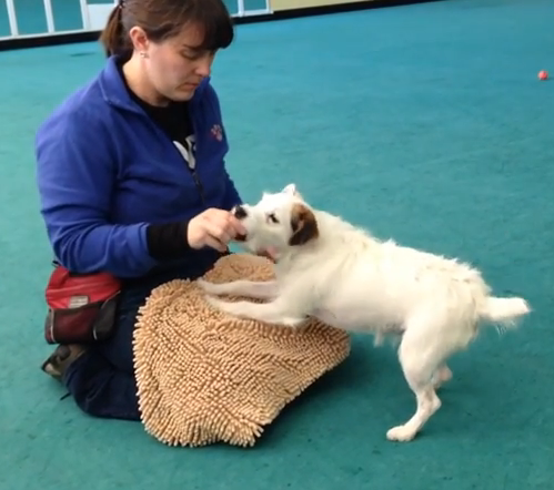 First we started with the special absorbent towel on our lap. The towel on the lap became the cue to stand on the towel on our lap. Once there we shaped her wiping her feet down the lap. She was wiping her own feet! Then we added wrapping the towel around her paws and having her “pull” her foot out. We took the natural instinct to pull away and clicked it. You should have seen how shocked she was being rewarded for pulling away. Now she is wiping her whole foot and leg!