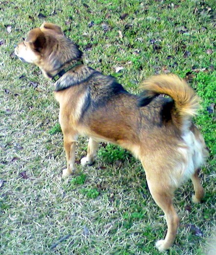 My mixed breed dog Summer probably had some northern breeds in the mix. She held her tail at different heights depending on her mood and activities. She wasn’t all that waggy, but she had a beautiful, low, wide wag when she saw someone she loved. When her tail was tightly curled up over her back it always meant she was aroused, often predatory. In this photo, she was watching a cat on the other side of our fence.