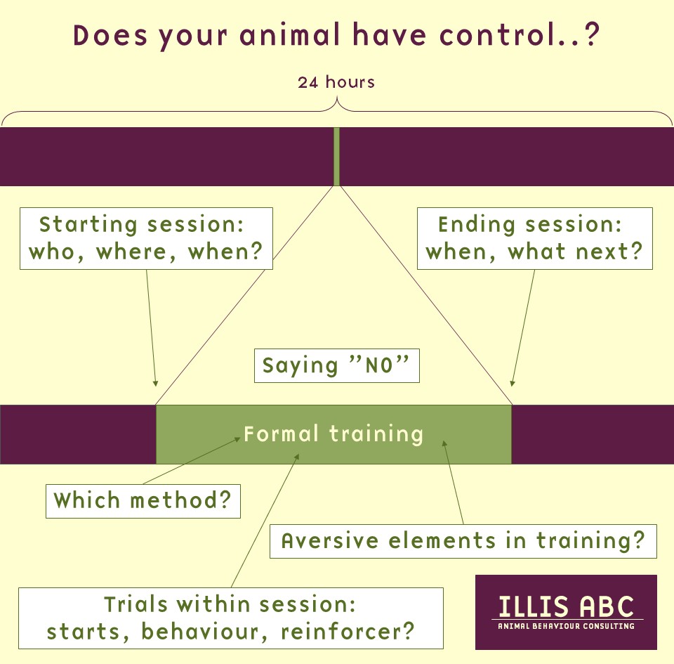 - Are there any aversive elements in the training, as in: are you trying to help the animal overcome fear? And if so, are you giving the animal a degree of control over that fearful stimulus?