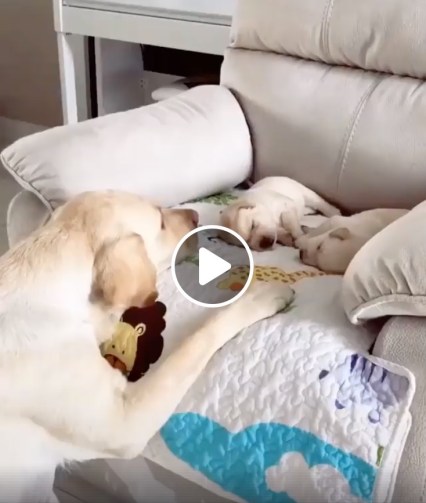 So the likely scenario is that someone put this lab’s two puppies in the chair, and she came to watch over them. Then someone rocked the chair from behind.