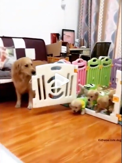 - The adult golden can open the gate and hold it, but almost closes it with half the puppies still inside. She appears stressed.