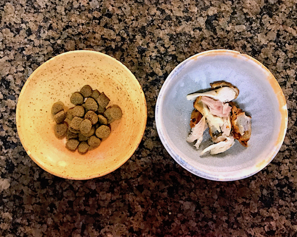 The concept is simple. The dog gets a treat for the behavior of swallowing a pill. But you don’t have to start with pills. You can start with low-value treats such as kibble. Something you’re sure the dog will eat. Swallow a piece of kibble, get a much better treat! Then work your way through bland items, non-food but safe items, and finally to pills. With Clara, the sequence was kibble, pieces of carrot (which she does not consider food), empty capsules made of gelatin, then actual antibiotic pills.