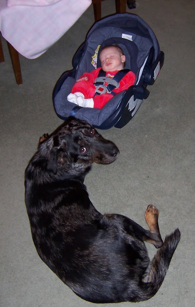 The dog training school where I teach has a exciting new partnership with Babies-R-Us: We’re about to start monthly seminars for expecting and new parents on finding your “new normal” with a baby plus a dog. I’m using today’s post to organize my thoughts and brainstorm a bit. I’ll lay out the best advice I’ve gathered from my research and toss out some insights from personal experience. I’m also inviting readers–other trainers, dog lovers, parents–to share their knowledge, success stories, and cautionary tales.
