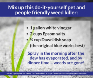 One alternative to toxic chemicals is offered by Denise Fleck. She suggests mixing one gallon of white vinegar, two cups Epsom salts, one-quarter cup Dawn (blue) dish soap in a sprayer. “Spray in the morning after the dew has evaporated and by dinner time…weeds are gone.”