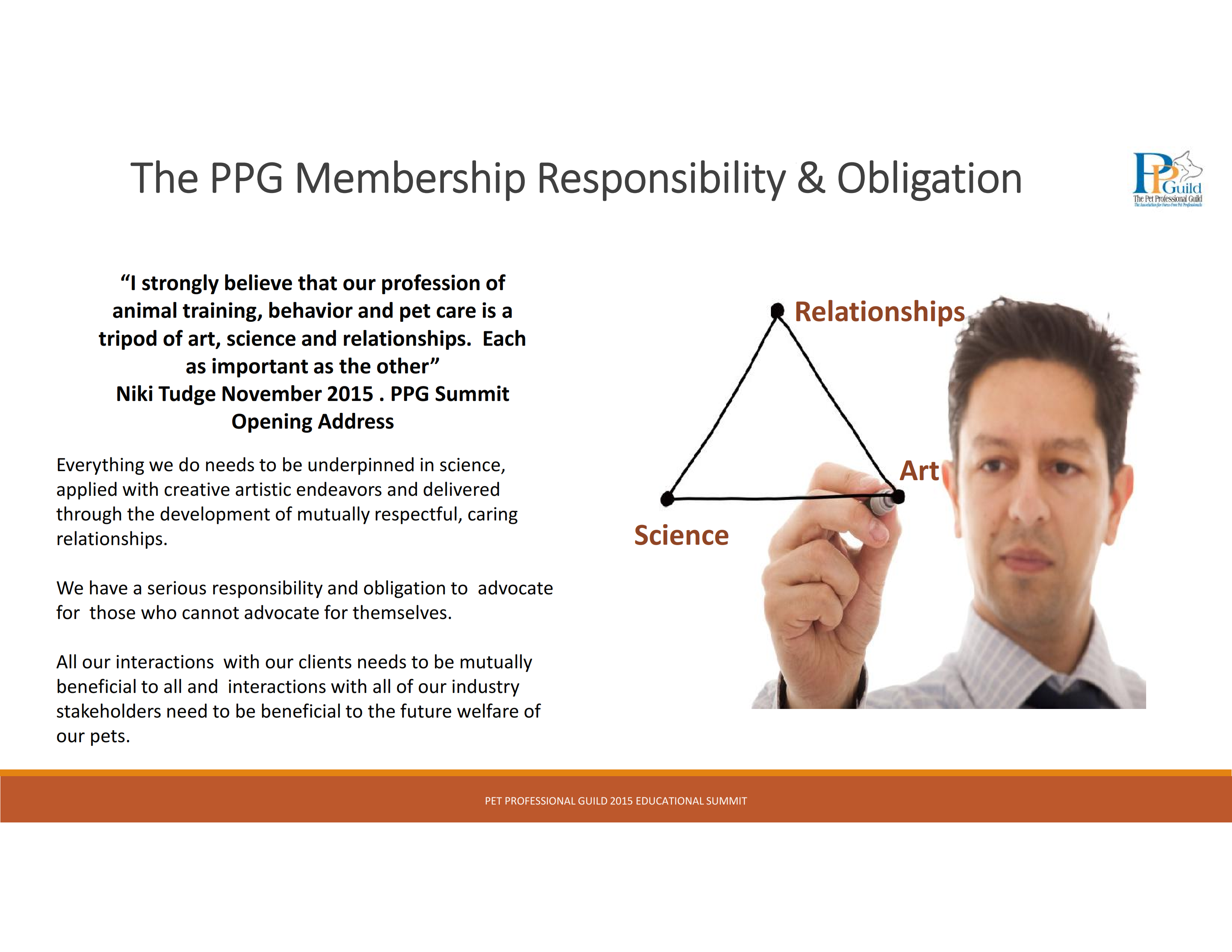 • In my humble opinion the profession of animal training, behavior and pet care is a tripod of art, science and relationships, and each is as important as the other.