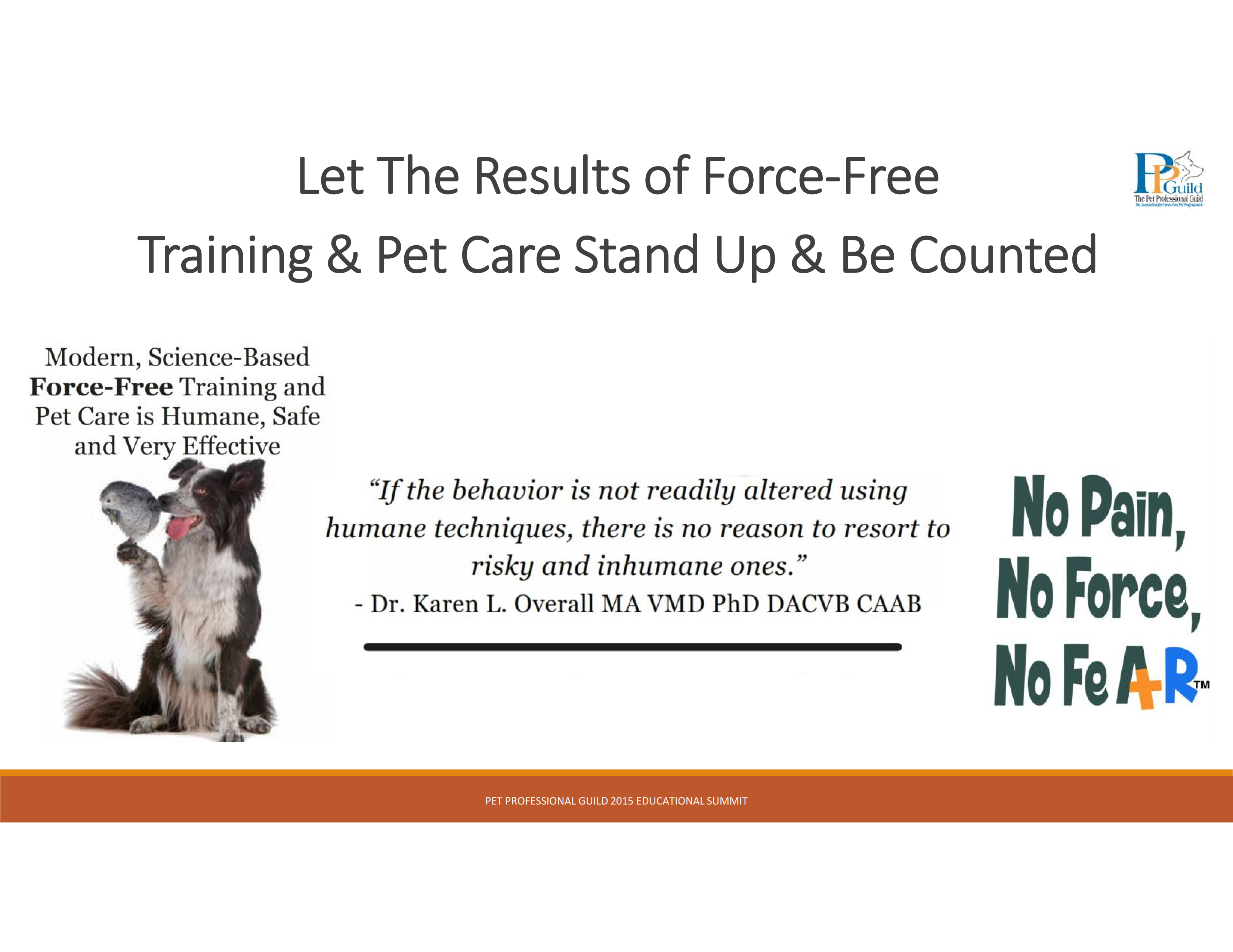 • We do not have to convince everyone that our way is right. We must simply engage and motivate them to try. The results of force-free training stand up and are supported by science; they work best for everyone.