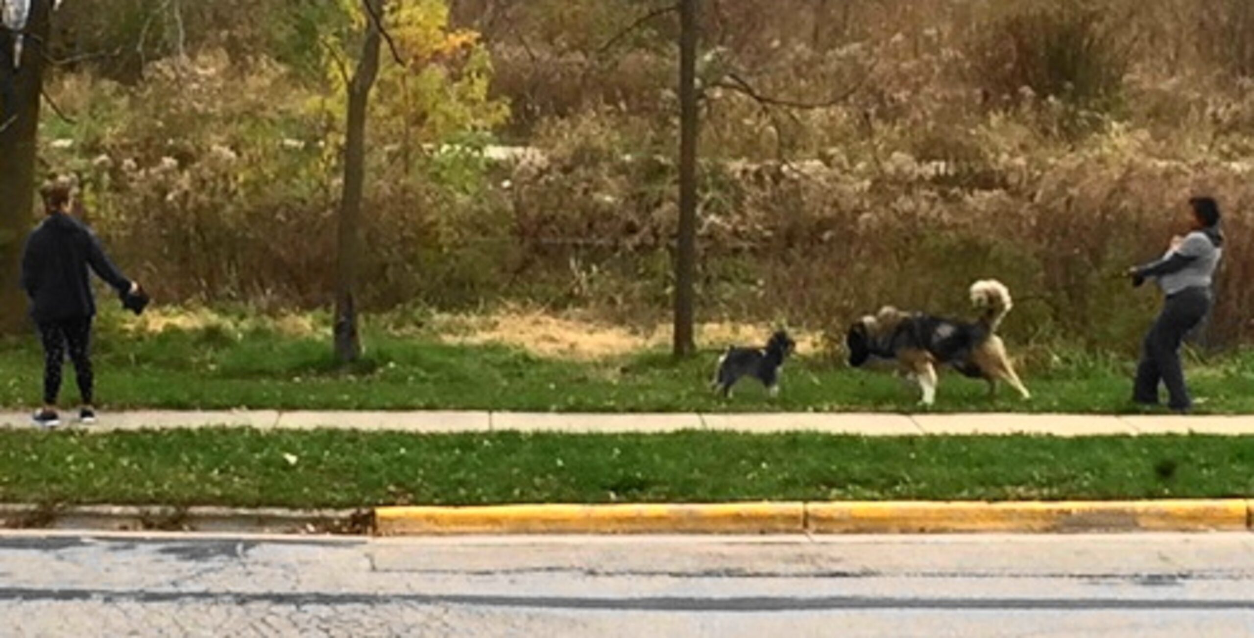 The Poodle became more alarmed and both dogs lunged at each other when they came within range. The man struggled to hold back his Boxer, who was launching vertically and spinning in the air like a crazed ballet dancer.