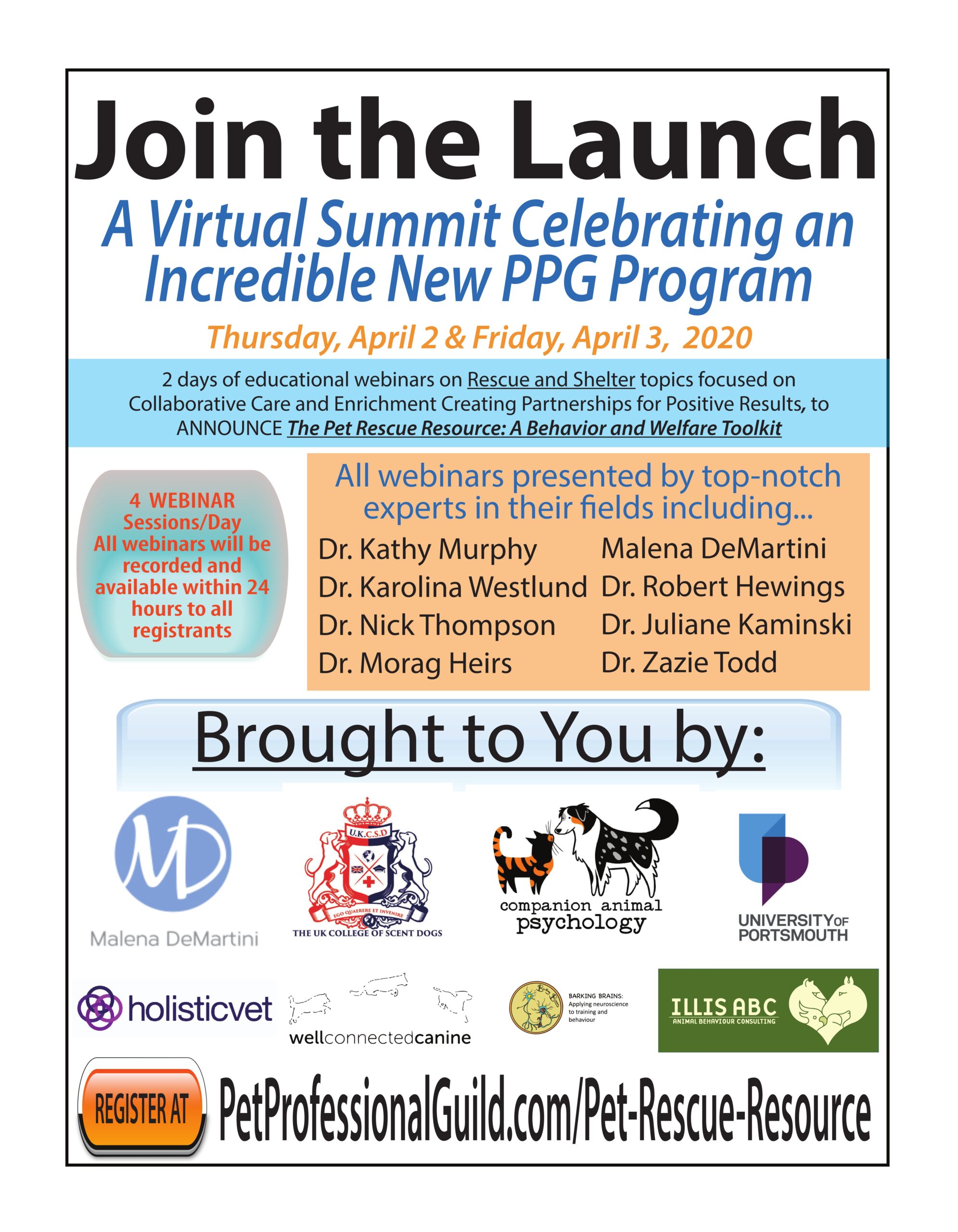 Registration for the Virtual Summit opens online today, Monday, February 17, 2020 through either the PPG (petprofessionalguild.com/Pet-Rescue-Resource) or PPGBI (ppgbi.com/Pet-Rescue-Resources) website and registrants will gain access not only to the live event, but also to audio session recordings for their own personal use for 12 months.