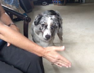 At the time of writing, Bix was almost 8 months old and was staying with me for board and train. The focus of his training was jumping and biting, but the truth is, he taught me as much as I taught him. Silly me though, I did not initially get quite enough information about his undesirable behaviors and was caught by surprise in the middle of the first night of his stay when he had vomited and I got up to clean it. I saw his “worried” face but it did not quite register in my sleepy mind. When I tried to clean the carpet, however, he bit me hard four or five times. Fortunately, he did not break the skin – which revealed a degree of bite inhibition – but they were hard bites nonetheless and I felt the pain for several days. That set up a tone of, shall we say, mistrust, for the rest of his stay and I became very aware of his body language and his emotional state. I was intrigued by how this young dog, who appeared to be so easy going and friendly, could change so rapidly.
