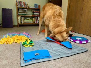 Gustatory Aids and Enrichment: There are many ways to satisfy a dog’s hunger while engaging his mind, which will result in tiring his body. A few examples that work well for my clients: Food puzzles, foraging and scent exercises, or a stuffed, frozen Kong.