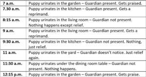 What we think we are teaching the puppy is that it is good to urinate in the yard and wrong to urinate in the house. What the pup is actually learning, however, is that sometimes it is rewarding to urinate when his guardian is present and sometimes it is dangerous. And that it is always safe to urinate when the guardian is not present and that, so far, the safest place is under the dining room table.