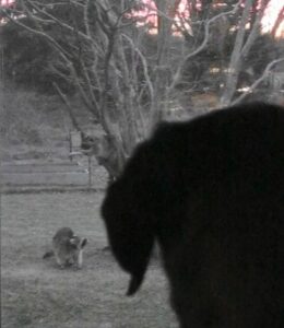Several years earlier we were relaxing on the porch while Gandhi and Buddha laid by the door, when another raccoon strolled by. Before I even saw the visitor Buddha and Gandhi had jumped to their feet and burst through the screen. I shouted “Leave it!” before my conscious brain had even suggested the words to me. Fortunately my prior training prevented any harm to the raccoon, but I was left with a screen door to repair…and a new training plan.