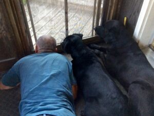 My dogs watched in silence. There was no barking, whining or growling. They did not fidget, pace, paw at the door or lunge toward what they must have perceived as prey. I whispered soft words of praise as their body language relaxed. Gandhi was the first to lie down, on his left hip in a relaxed position. He occasionally turned his head to casually look back at me. Then Buddha moved to Gandhi’s right side, and sat down. Ultimately he laid on his stomach.