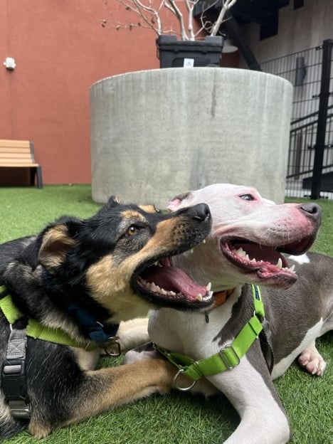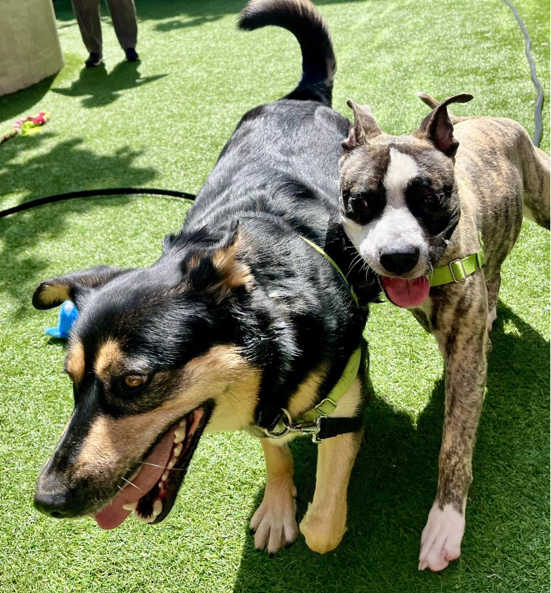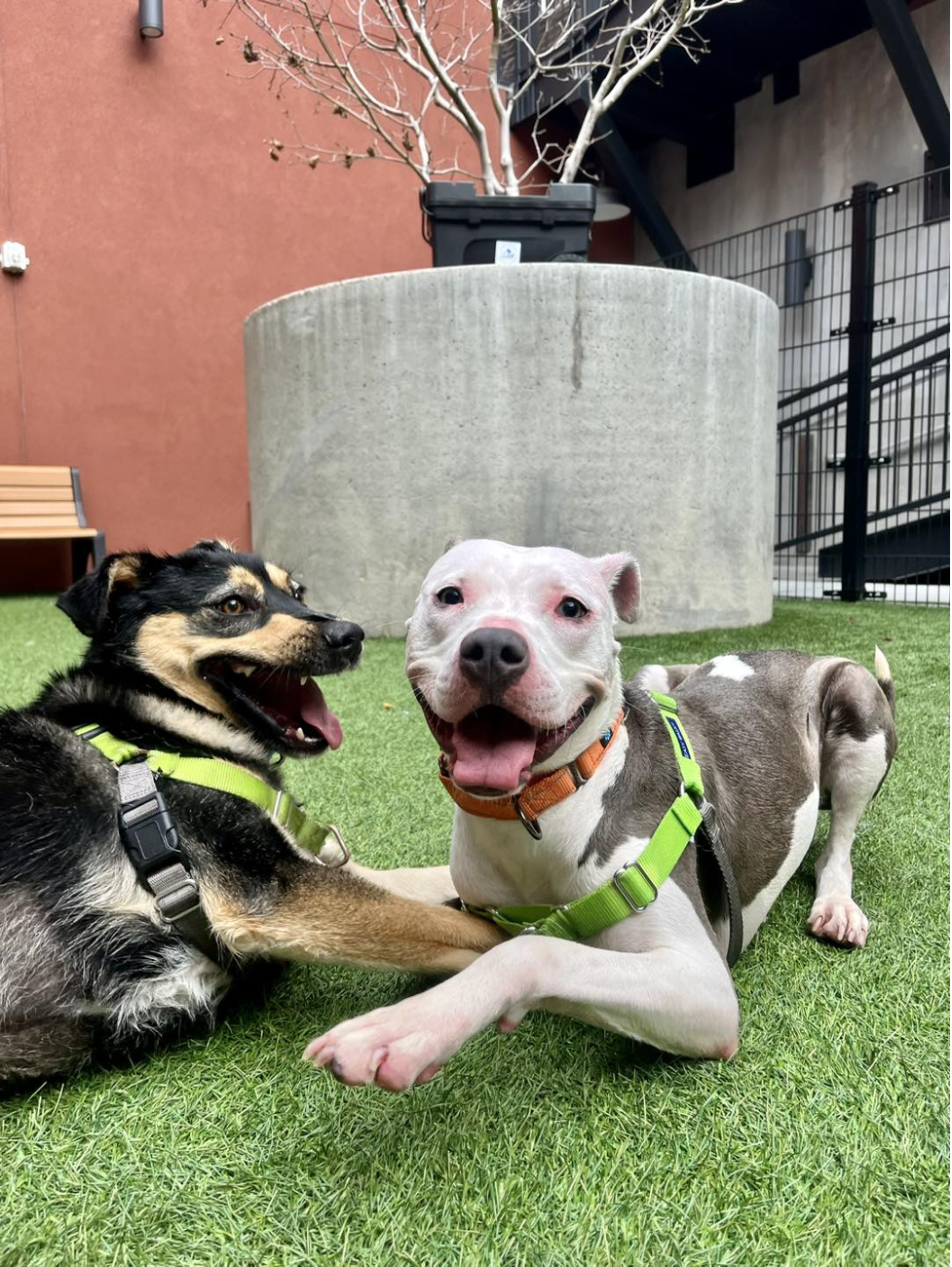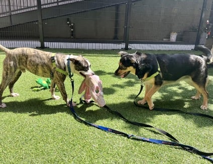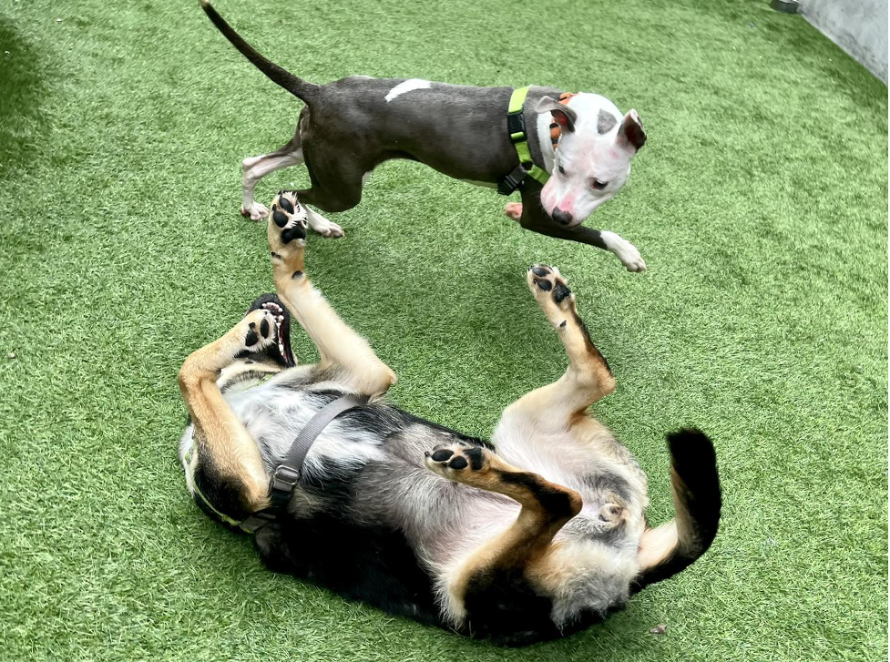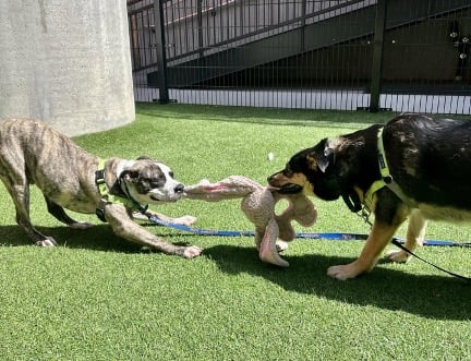 The Behavior Team knew that preventing on-leash reactions and responding to them quickly when they did happen was only one piece of the Daisy puzzle. Because she loved other dogs, we also wanted to ensure she was getting a regular dose of them to help satiate her need to socialize. I say “need” and not “want” because dogs are highly social animals, and positive interactions with members of their own species is not optional when addressing overall wellness. A percentage of dogs are truly anti-social or otherwise have behavior issues that prevent them from socializing, but this wasn’t the case with Daisy, despite how scary her on-leash reactions could look to most people. The Behavior Team ran weekly playgroups with a squad of specially trained volunteers who were well-versed in dog body language and play management, and Daisy was a star participant throughout her 10 months in the shelter. She was an intense and high-energy playmate, so we took care to match her with other dogs who enjoyed her play style and forwardness. One of Daisy’s playgroup volunteers reminisced, “Something that sticks with me is her awesome playgroup behavior. She was so patient with other dogs—such a playgroup superstar. She also maintained really well during her time.” One of Daisy’s favorite pastimes involved playing tug with other dogs and letting bigger bully mixes drag her across the yard by the other end of the stuffie in her mouth as her energy began winding down at the end of a session.
