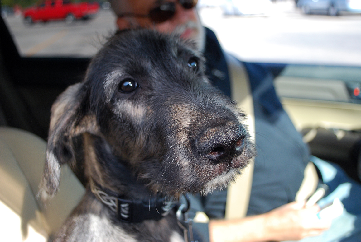 It was Oona’s second time in an automobile and it was unavoidable. My wife and I left at 3 a.m., hoping to shave off several hours of the journey in darkness while Oona slept. She didn’t. From her viewpoint, the car was a scary place. Strange roaring sounds, gears shifting, bumps and lurches, a spray of lights, a virtual spookhouse of the unexpected and unexplained. When we took the hourly puppy bathroom break at a rest stop, an 18-wheeler vented its air brakes and badly startled Oona. She curled up in a ball on the seat next to my wife. It was not an auspicious beginning.