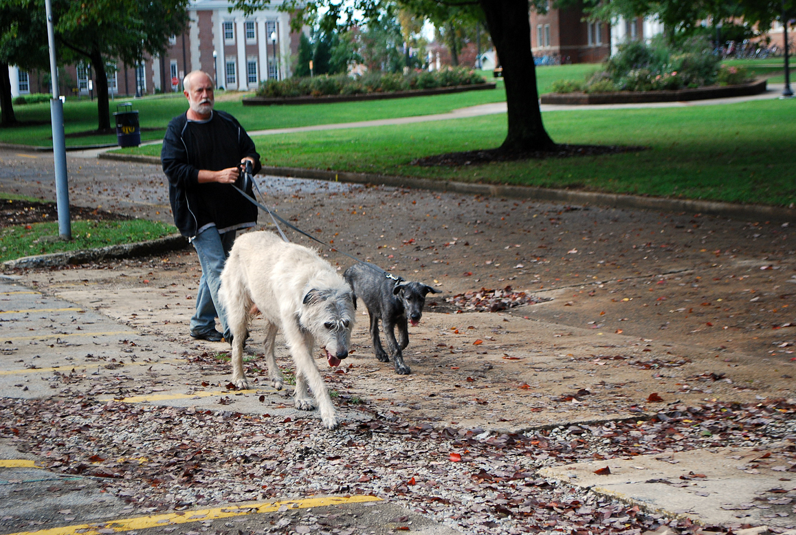 Did I mention the monsoons? It’s normally Indian Summer here, but Tennessee has had one of its wettest autumns in years. Days of relentless rain followed by showers that always seemed to pop up when Oona was awake. All puppies sleep a lot. The trick with young Irish wolfhound puppies, who undergo outrageous growth spurts, is finding the odd hour when they’re fully awake. When rain was coming down sideways, we went to the two stores in my town that allow dogs inside. More fresh people and new sensations. All encountered while we carefully watched our puppy. And — this is important — while we stayed reassuringly calm and upbeat. The few times she startled, she came back to us, quickly rebounded and went back for another dose.