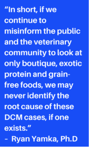 In short, if we continue to misinform the public and the veterinary community to look at only boutique, exotic protein and grain-free foods, we may never identify the root cause of these DCM cases, if one exists. The veterinary community should lose the mind-set that they are caused by so-called BEG foods. Instead, if signs of DCM do exist, veterinarians should go through the battery of tests to confirm the presence of DCM and report it regardless of what the dog is consuming (Yamka, 2019) [emphasis added].