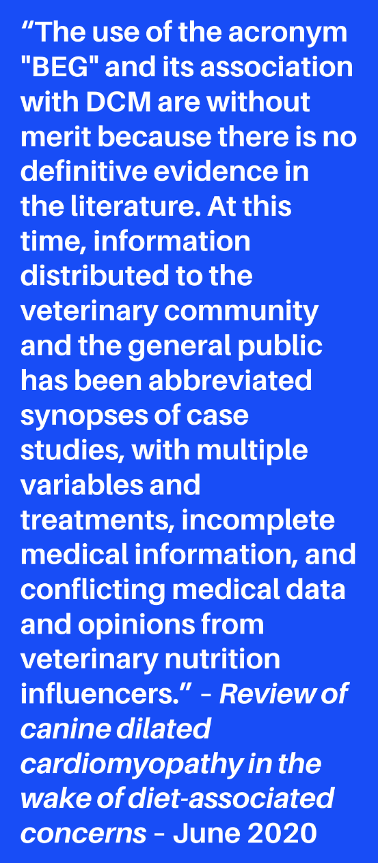 Recently, a correlation between diets with specific characteristics, such as, but not limited to, containing legumes, grain-free, novel protein sources and ingredients, and smaller manufactured brands, to DCM has come under scrutiny by academic researchers and the FDA. The use of the acronym “BEG” and its association with DCM are without merit because there is no definitive evidence in the literature. At this time, information distributed to the veterinary community and the general public has been abbreviated synopses of case studies, with multiple variables and treatments, incomplete medical information, and conflicting medical data and opinions from veterinary nutrition influencers. Also, in past literature, sampling bias, overrepresentation of subgroups, and confounding variables in the data weaken this hypothesis. Additionally, based on current literature, the incidence of DCM in the overall dog population is estimated to be between 0.5% and 1.3% in the United States. However, the FDA case numbers (560 dogs) are well below the estimated prevalence. Therefore, it is impossible to draw any definitive conclusions, in these cases, linking specific diets or specific ingredients to DCM (McCauley et al., 2020) [emphasis added].