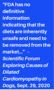FDA has no definitive information indicating that the diets are inherently unsafe and need to be removed from the market, but we are continuing to work with stakeholders in assessing how the diets may interact with other factors that may be impacting non-hereditary DCM (FDA, 2022) [emphasis added].