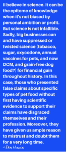 I believe in science. It can be the epitome of knowledge when it’s not biased by personal ambition or profit. But science is not infallible. Sadly, big businesses can and have suppressed or twisted science (tobacco, sugar, oxycodone, annual vaccines for pets, and now DCM and grain-free dog food) for financial gain throughout history. In this case, those who presented false claims about specific types of pet food without first having scientific evidence to support their claims have disgraced themselves and their profession. Moreover, they have given us ample reason to mistrust and doubt them for a very long time.