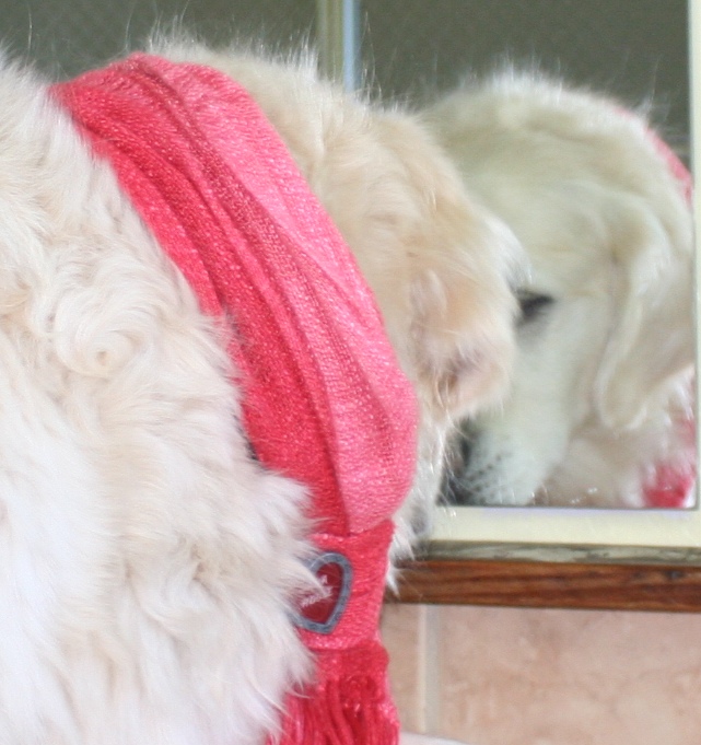 In fact, an observant puppy owner can often pinpoint the moment when this recognition dawns. When Jana, my 11-year-old golden, was a puppy, her Aunt Daisy and Uncle Buddy, mature adult dogs, refused to play with her. She was larger than they were and full of that annoying puppy energy. Her big brother, Timo, was just plain mean to her. In need of playmates, Jana wandered into the bedroom at my mom’s house one day. Imagine her joy to discover another puppy! Jana earnestly play-bowed to this puppy, who always bowed back. But their play never progressed beyond enthusiastic bowing.