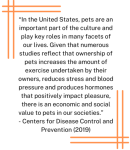 In the United States, pets are an important part of the culture and play key roles in many facets of people’s lives. Given the number of studies reflecting that ownership of pets increases the amount of exercise undertaken by their owners, reduces stress and blood pressure, and produces hormones that positively impact pleasure, there is an economic and social value to pets in our societies (Centers for Disease Control and Prevention, 2019). In children, pet ownership has been shown to reduce allergies and assist with development. And let us not forget or underestimate the many functions pets serve and perform for the sick, disabled, and those in need of assistance (Hunter & Brisbin, 2016).