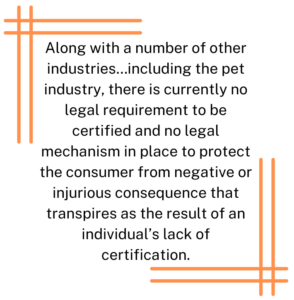Certifications recognize individuals for meeting specific criteria of skills and knowledge. They are a way for practitioners to seek self-promotion and differentiate themselves from their competitive set. Certifying organizations set standards of competency and their certification programs are designed to use these predetermined competencies as benchmarks for pass or failure performances. Consumers draw inference from certifications that a professional has met a specific standard of competency and/or carries a particular body or depth of pertinent knowledge. Along with a number of other industries, however, including the pet industry, there is currently no legal requirement to be certified and no legal mechanism in place to protect the consumer from negative or injurious consequence that transpires as the result of an individual’s lack of certification.
