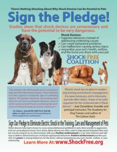 I have been waiting for an organization of pet professionals to take a stand against the use of shock collars since 2002, so when Pet Professional Guild launched the Shock-Free Coalition on September 25, 2017 I was more than ready to sign the pledge to eliminate shock devices from the supply and demand chain. However, I also knew that signing the pledge, while an important step, was not going to be sufficient to stop the use of shock collars. Signing the pledge is just the beginning of what will very likely be a long campaign. In addition to signing the pledge, as many of us as possible must commit to educating others in our profession, other pet professionals, and pet parents about the dangers of shock. This educational effort will also require that many of us become advocates and publicly speak on behalf of dogs, who cannot speak for themselves. Read more.