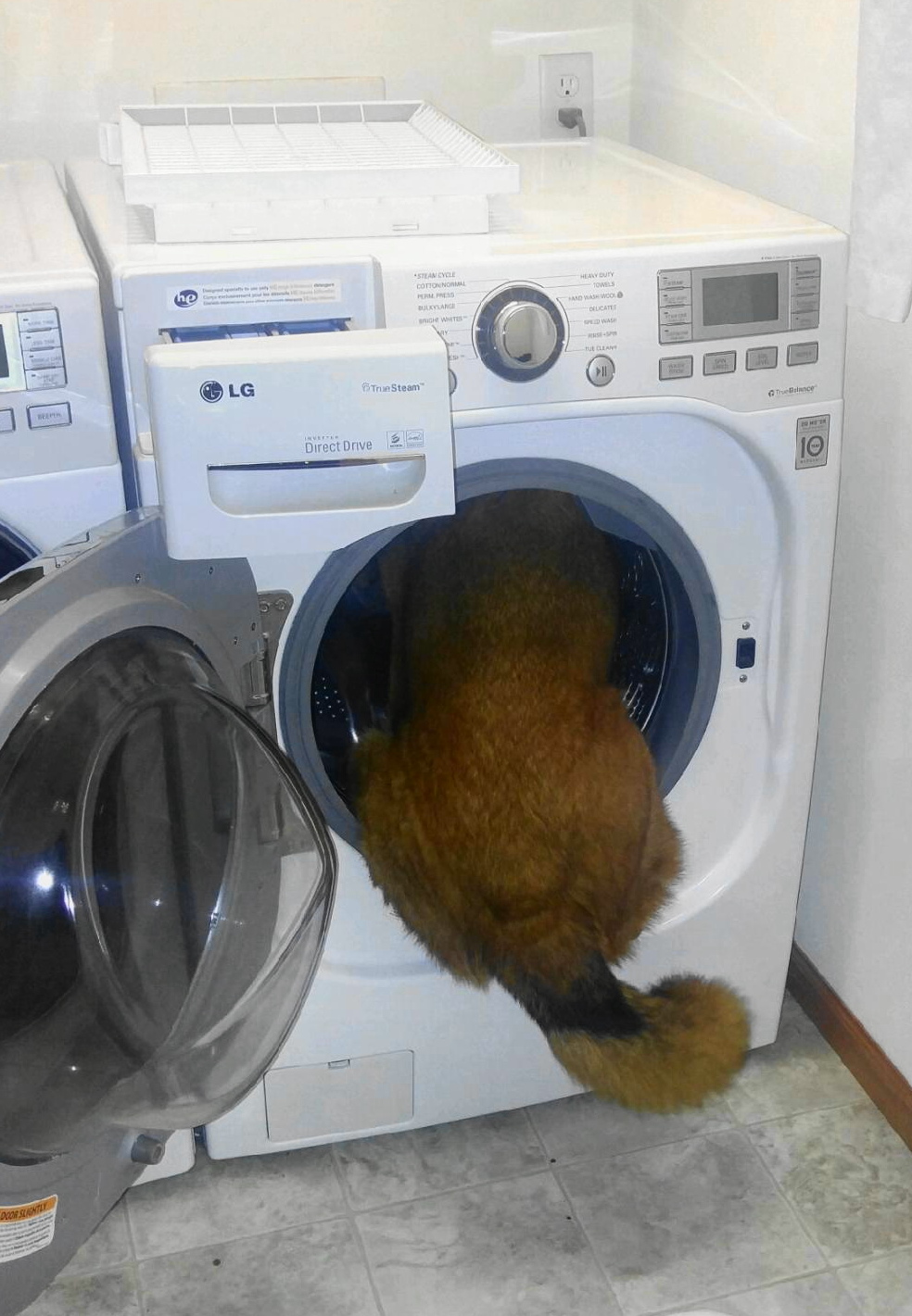 A dog client I worked with found her own solution to impending thunderstorms. Kona sought refuge in the family washing machine.