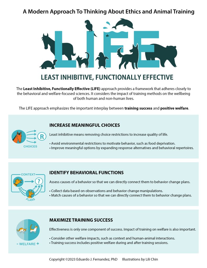 Least Inhibitive, Functionally Effective (LIFE), developed by Dr. Eduardo Fernandez, is an alternative approach to ethical animal training methods that specifies (1) increasing choices by inhibiting less, (2) the importance of function, and (3) defining success as more than simply being effective.