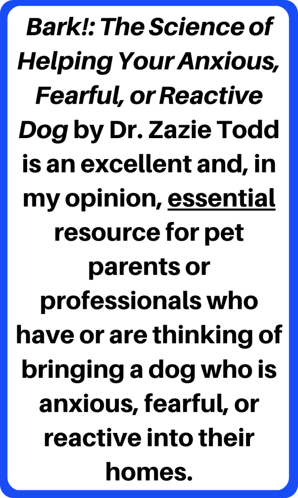 Bark!: The Science of Helping Your Anxious, Fearful, or Reactive Dog by Dr. Zazie Todd is an excellent and, in my opinion, essential resource for pet parents or professionals who have or are thinking of bringing a dog who is anxious, fearful, or reactive into their homes.