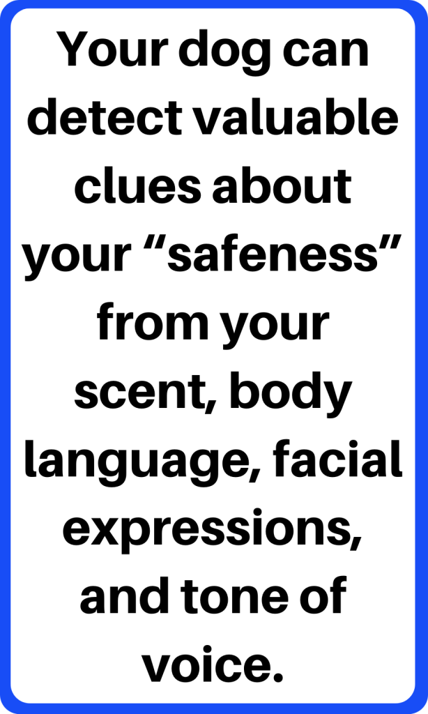 To be safe living in proximity to their most dangerous predator, humans, the wolves who became dogs had to develop the ability to assess which humans were safe and which were dangerous. Their survival would depend on this ability. Your dog can detect valuable clues about your “safeness” from your scent, body language, facial expressions, and tone of voice.