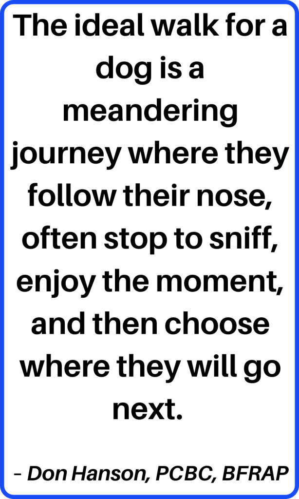 Walking in lockstep with another living being is NOT normal canine behavior. As our pet’s life partner, one of our responsibilities is to ensure they have ample opportunity to exhibit normal behaviors for their species. The ideal walk for a dog is a meandering journey where they follow their noses, often stop to sniff, enjoy the moment, and then choose where they will go next.