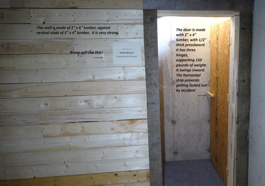I decided to transform the space beneath our basement stairs to a shelter, which I named Hotel Bruno – Presidential Suite.