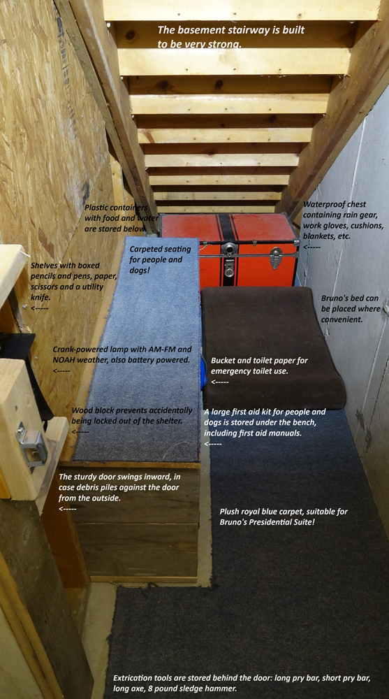 If your pet(s) are afraid of going to the basement, as our dog Gandhi once was, now is the time to do some training/conditioning to prepare for an emergency trip to the basement.
