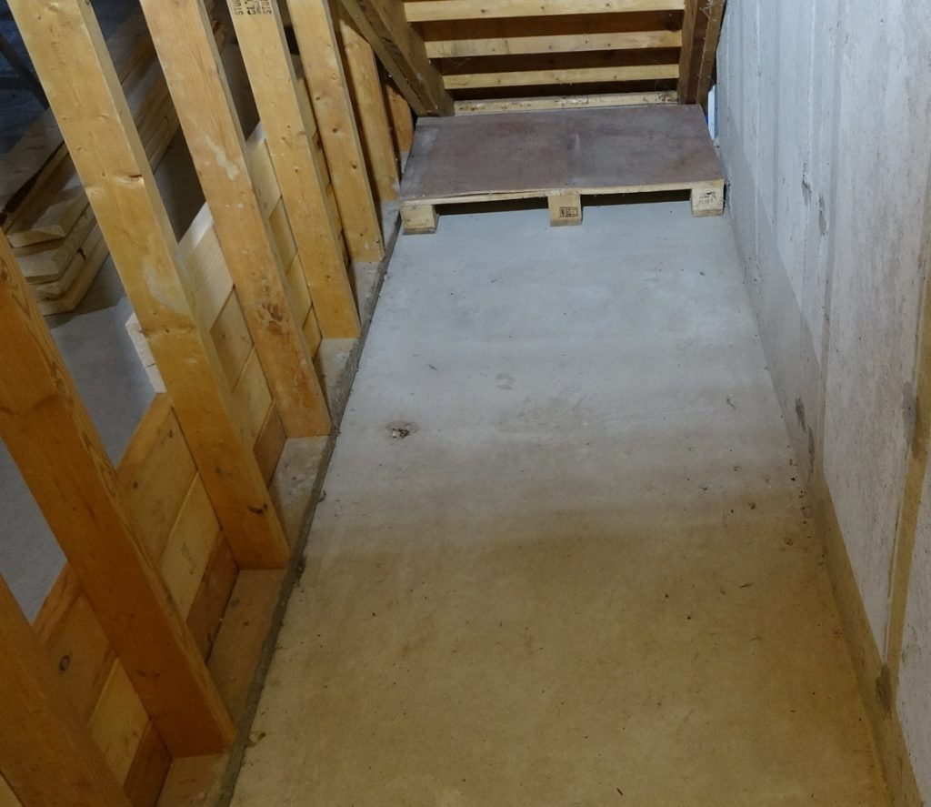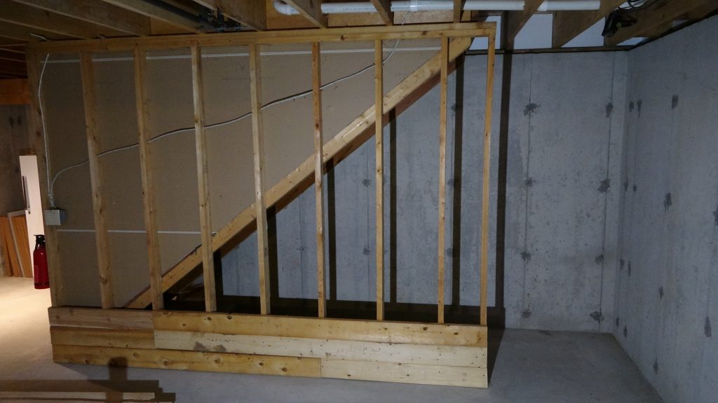 To bolster the strength of the structure, I attached 2”x6” horizontal planks to the 2”x4” vertical studs and created a doorway, to which I later attached a sturdy door with a latch. The door swings inward in case debris falls outside of it. I installed a bright light to illuminate the enclosed stairway space.
