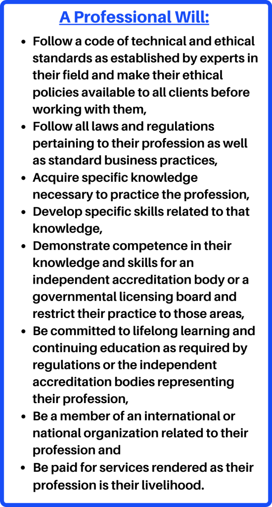 Almost all professions follow the attributes listed under the heading “A Professional Will:”