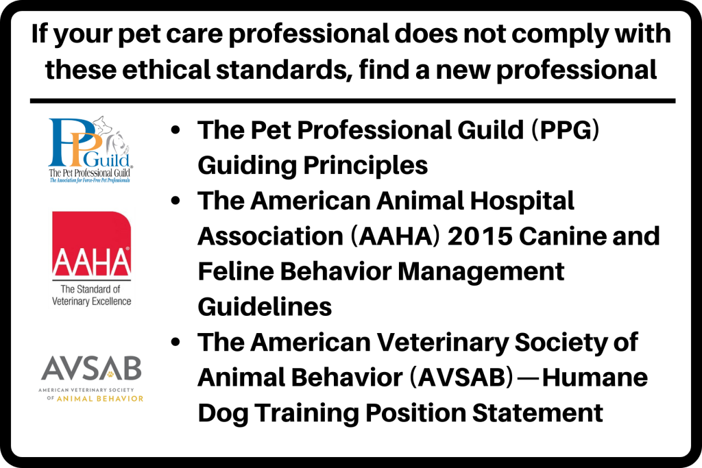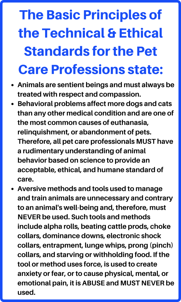 In the USA, there are three technical and ethical standards for pet care professionals established by experts in the field. While these standards focus on training and behavior, they apply to all pet care professionals who deal with living, breathing, sentient beings.